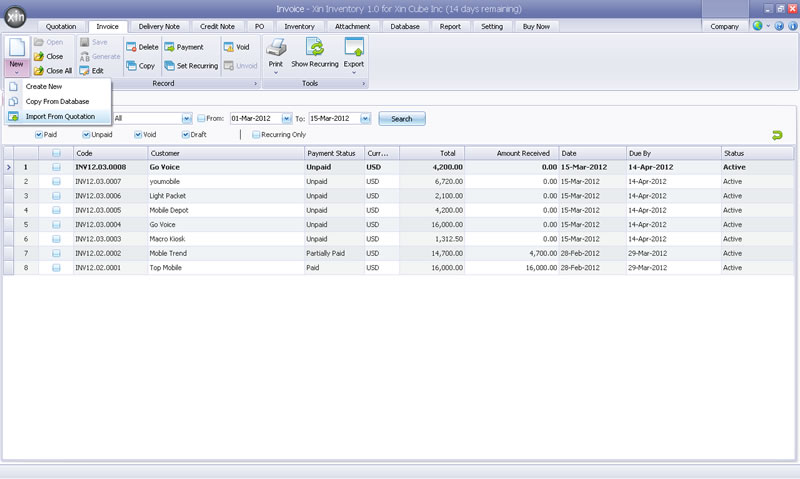 Invoice module is very comprehensive in Xin Inventory software. User can select different price level for different customer. Recurring invoice features also included in Xin Inventory software.